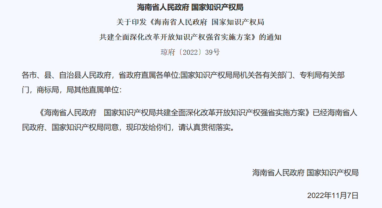 海南省人民政府 国家知识产权局关于印发《海南省人民政府 国家知识产权局共建全面深化改革开放知识产权强省实施方案》的通知琼府〔2022〕39号各市、县、自治县人民政府,省政府直属各单位;国家知识产权局局机关各有关部门、专利局有关部门,商标局,局其他直属单位:《海南省人民政府  国家知识产权局共建全面深化改革开放知识产权强省实施方案》已经海南省人民政府、国家知识产权局同意,现印发给你们,请认真贯彻落实...